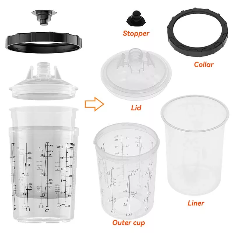 Ce système de gobelets à peinture jetables de 400 ml 1.0 remplace essentiellement le gobelet traditionnel à alimentation par gravité car il permet non seulement d'économiser plus de peinture, mais améliore également l'efficacité de la peinture. Plus précisément, la conception exquise de la descente automatique en spirale du revêtement lors de la peinture permet à la peinture d'être pleinement utilisée ; pendant ce temps, la conception de verrouillage rapide et de remplacement du revêtement évite de laver la tasse, permettant ainsi d'effectuer le travail de peinture de manière efficace et répétée. Nous avons des adaptateurs pour presque toutes les marques de pistolets pulvérisateurs sur le marché afin de répondre aux besoins d'expérience des différents passionnés de pistolets pulvérisateurs. L'adaptateur est en acier inoxydable, résistant à la corrosion de la peinture et très durable. La combinaison étroite de la doublure avec le couvercle garantit que le système de gobelets ne fuit pas de peinture pendant la peinture et permet le stockage à long terme de la peinture inutilisée pour éviter le gaspillage.