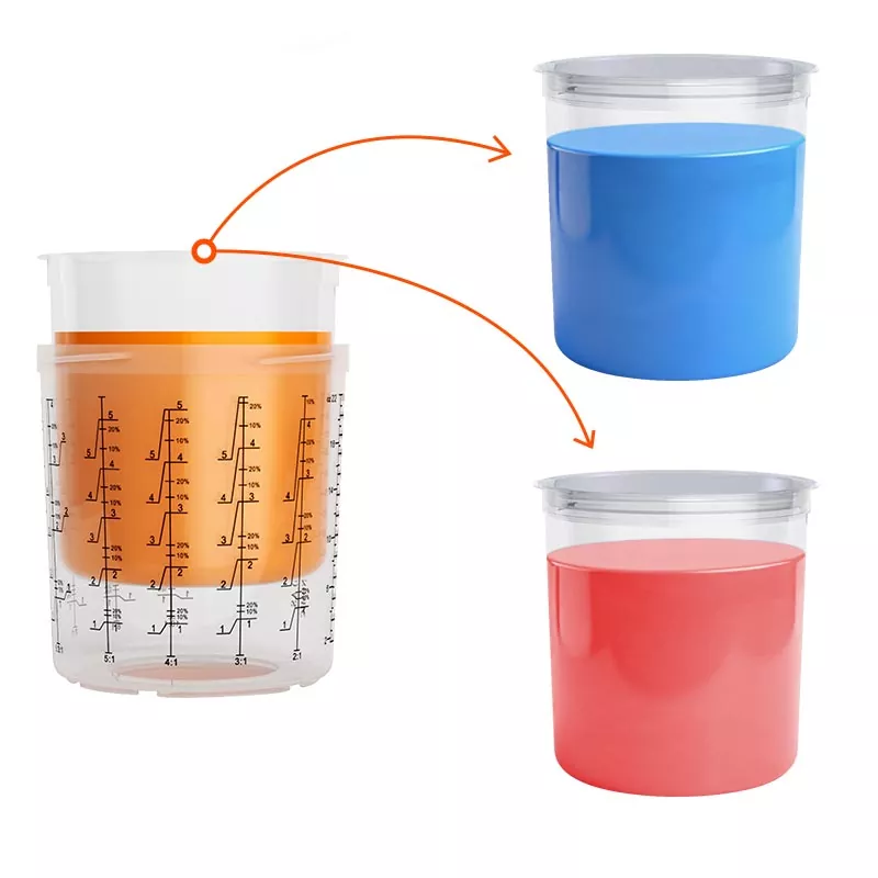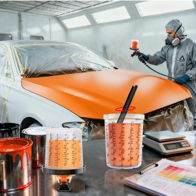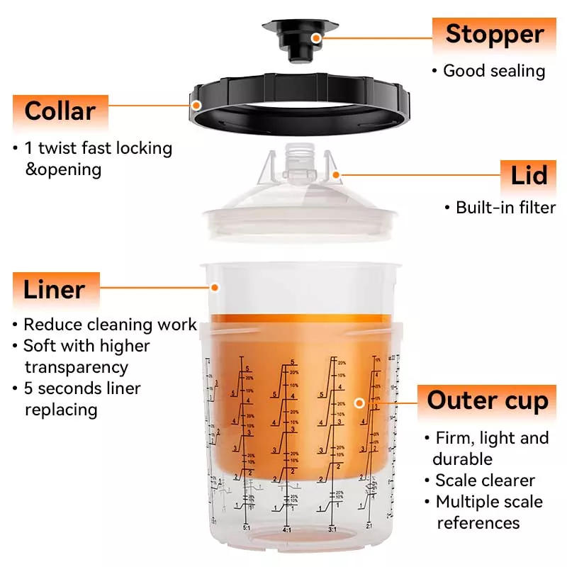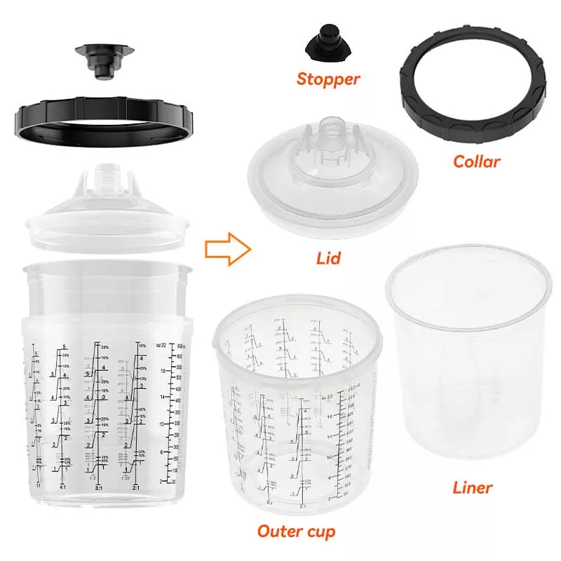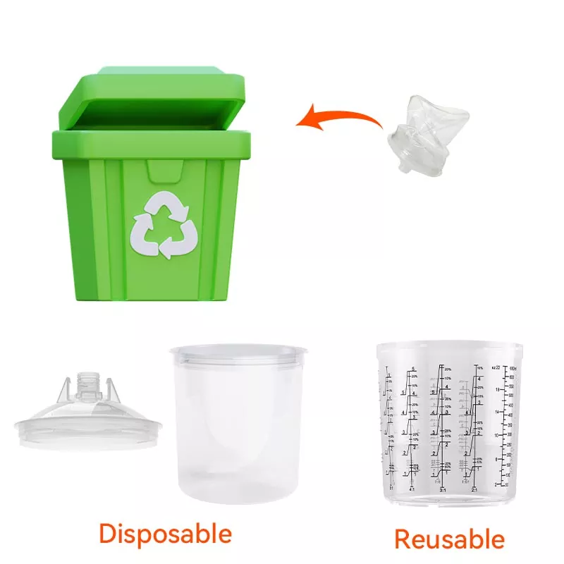 Le système de gobelets de peinture jetables combine les fonctions de mélange, de filtrage, de pulvérisation et de stockage dans une seule unité. Cela simplifie non seulement la préparation avant la peinture, mais permet également d'économiser le coût des gobelets de mélange et des entonnoirs en papier, ce qui en fait le choix idéal pour gagner du temps de préparation et améliorer l'efficacité de la pulvérisation.
