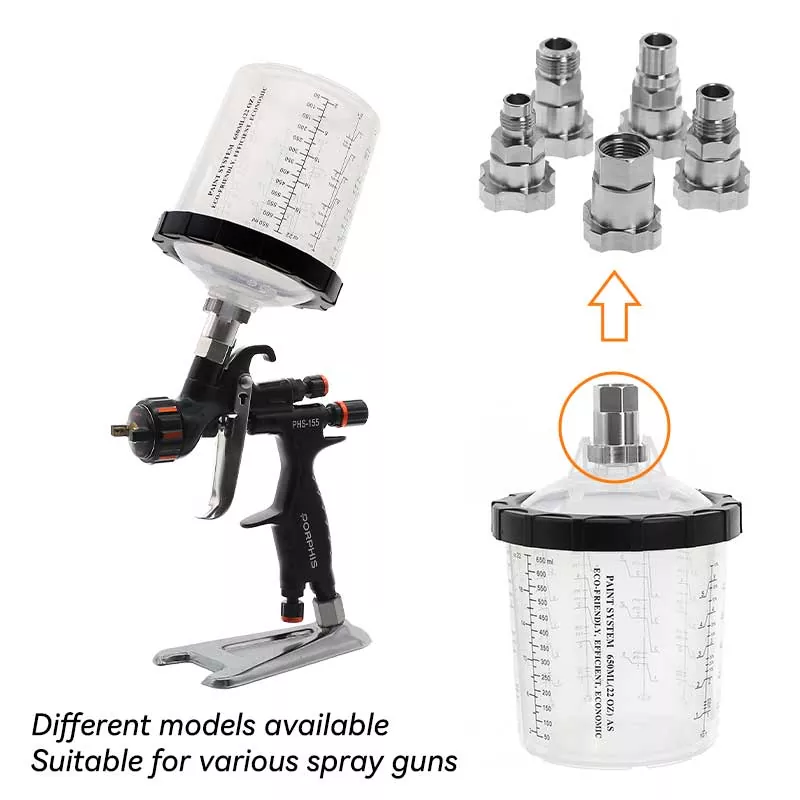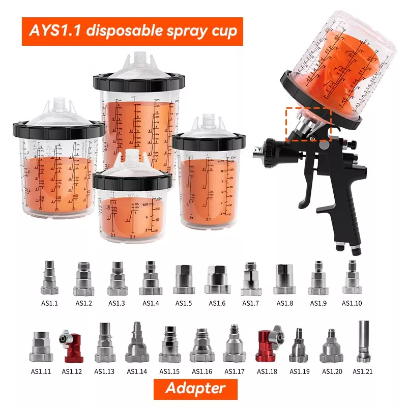 Le gobelet pulvérisateur jetable AYS1.1 est compatible avec l'adaptateur série PPS1.0. Grâce à l'adaptateur, il s'adapte parfaitement à n'importe quelle marque de pistolet et peut être utilisé dans n'importe quelle position sans risque de gouttes de peinture.