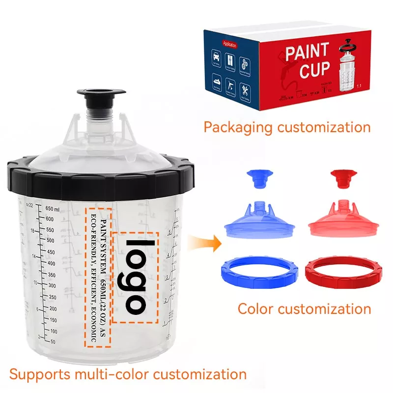 Le système de gobelets de peinture jetables de 600 ml 1.0 est le gobelet standard le plus polyvalent adapté aux zones où 22 fl oz ou moins de matériau sont pulvérisés. AYSPAT propose une variété de systèmes de gobelets PPS avec différents modèles parmi lesquels vous pouvez choisir, et peut également être personnalisé pour répondre à vos besoins : le gobelet extérieur peut être personnalisé avec le logo et l'échelle de votre marque, et le couvercle peut être personnalisé avec la couleur et le type de filtre. Nous nous engageons à développer des systèmes de gobelets pulvérisateurs jetables plus efficaces et plus pratiques pour aider les peintres à terminer leur travail de peinture de manière professionnelle et efficace.