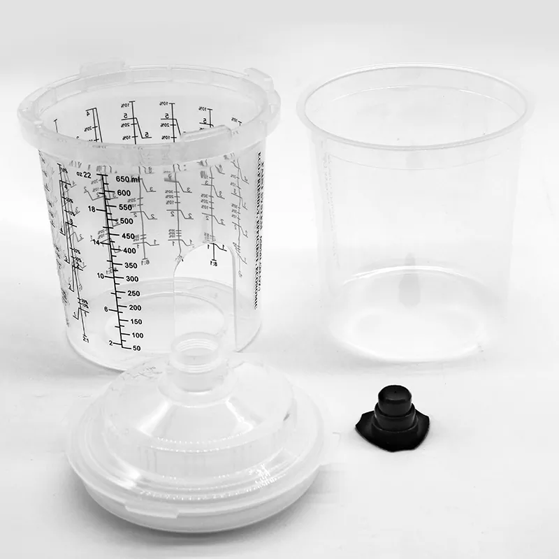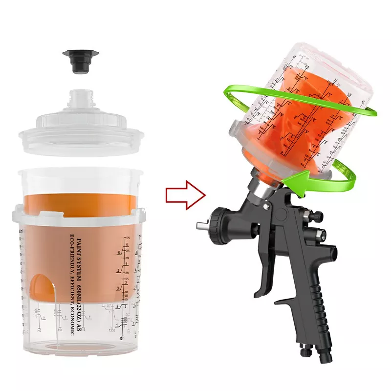 La tasse de pistolet à pulvérisation jetable de 650 ml propose un design instantané intégré sur le bord de la tasse extérieur. Le couvercle se verrouille sur la tasse extérieure en le tordant 1/4 tournant dans le sens des aiguilles d'une montre, réduisant davantage le temps nécessaire pour changer la tasse intérieure. Cela les rend particulièrement adaptés à la pulvérisation multicolore, à l'amélioration de l'efficacité du changement de couleur de peinture. La conception sans cols élimine également la possibilité que la coupe devienne inutilisable en raison d'un collier perdu.