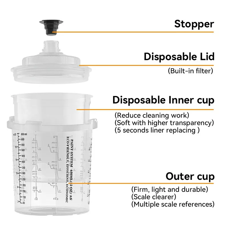Les tasses de pistolets à pulvérisation jetables Ayspat vous permettent de remplacer la doublure directement après utilisation, éliminant le besoin de nettoyage. Cela réduit non seulement les coûts des agents de nettoyage, mais permet également d'économiser du temps, l'amélioration de l'efficacité du pulvérisation. Les gobelets en aérosol jetables conviennent particulièrement pour pulvériser des finitions haut de gamme telles que les perles et les peintures métalliques, ce qui en fait le choix optimal pour le refinancement automobile haut de gamme.