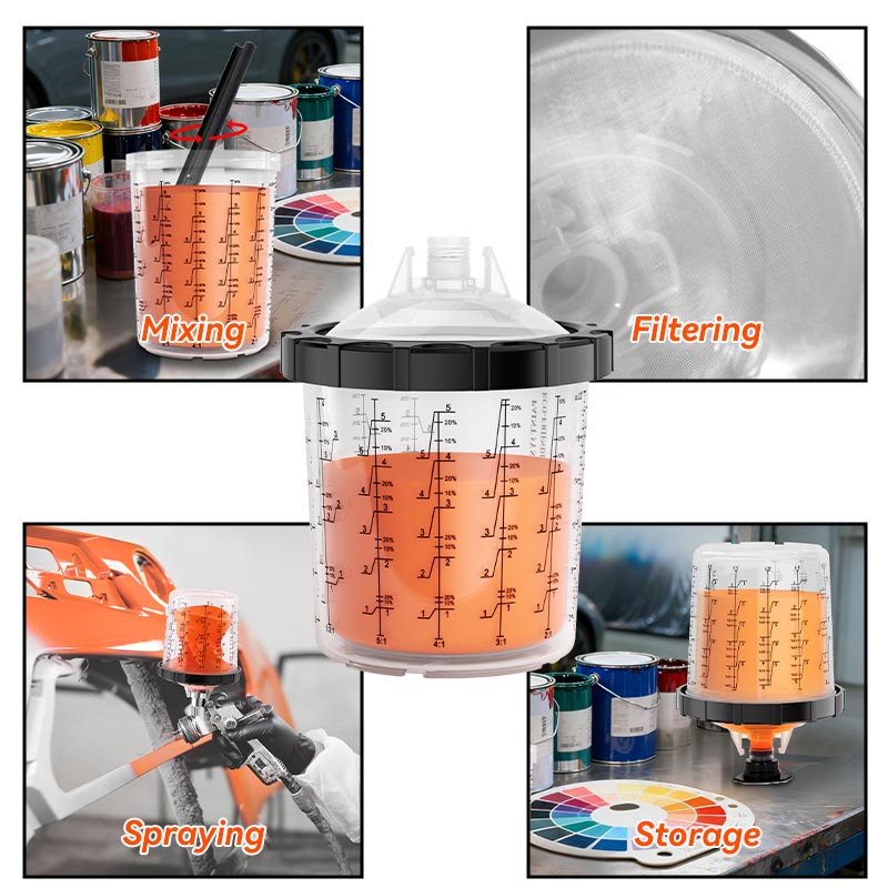 GLACE gobelet jetable combine les fonctions de mélange de peinture, d’agitation, de pulvérisation et de stockage dans une seule unité. Des marquages clairs et standardisés sur le corps de la bouteille permettent un mélange précis au millilitre près, réduisant ainsi les déchets à la source. Le joint de la tasse est testé sous pression pendant 72 heures pour garantir les fuites, et il résiste aux basculements et aux chocs sans déversement. Comparé aux gobelets pulvérisateurs traditionnels, lepot de peinture jetablepeut réduire la perte de peinture de 15 % et la consommation de solvants de nettoyage de 80 %, économisant ainsi de l'argent et de l'environnement.