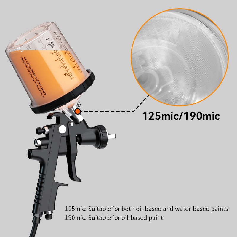 • Filtres intégrés pour une finition de peinture supérieure : Le capuchon de pulvérisation jetable est doté de filtres intégrés de 190 μ (peinture à base d'huile) et 125 μ (peinture à base d'eau), filtrant efficacement les impuretés pendant la pulvérisation et augmentant la brillance de la peinture de 20 %.