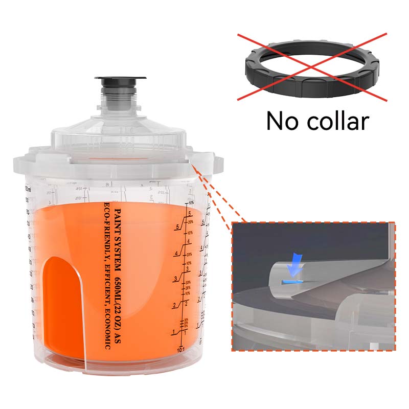 Le collier , qui constitue une connexion serrée entre la tasse et le couvercle, a longtemps été un élément crucial dans les systèmes de tasses en pulvérisation jetables. Pendant les séances de peinture occupées, les peintres perdent ou endommagent souvent le col, empêchant la tasse de pulvérisation jetable de fonctionner correctement, créant des défis importants.